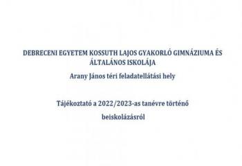 DEBRECENI EGYETEM KOSSUTH LAJOS GYAKORLÓ GIMNÁZIUMA ÉS ÁLTALÁNOS ISKOLÁJA Arany János téri feladatellátási hely Tájékoztató a 2022/2023-as tanévre történő beiskolázásról